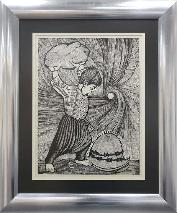 Other representations of the Palestinian struggle and dream appear in the artworks of Mustafa Al-Hallaj, whose works evoke Egyptian, Greek, and Roman mythology within a matrix that represents the aspirations towards a free Palestine. Al-Hallaj used masonite-cut and print on board as a means of presenting his art. During the same period, several Palestinian artists chose to address other issues that are not related to the Nakba. Laila Shawa’s work focused on the political realities, and became, in the process, a chronicle of the various events that affected Palestine. Mahmoud Taha chose to work with ceramics and Arabic calligraphy as a means to reflect Arab nationalism. Palestinian painter, draughtswoman, and engraver, Juliana Seraphim played a major role in the movement of parallel arts in Lebanon, including poster design.