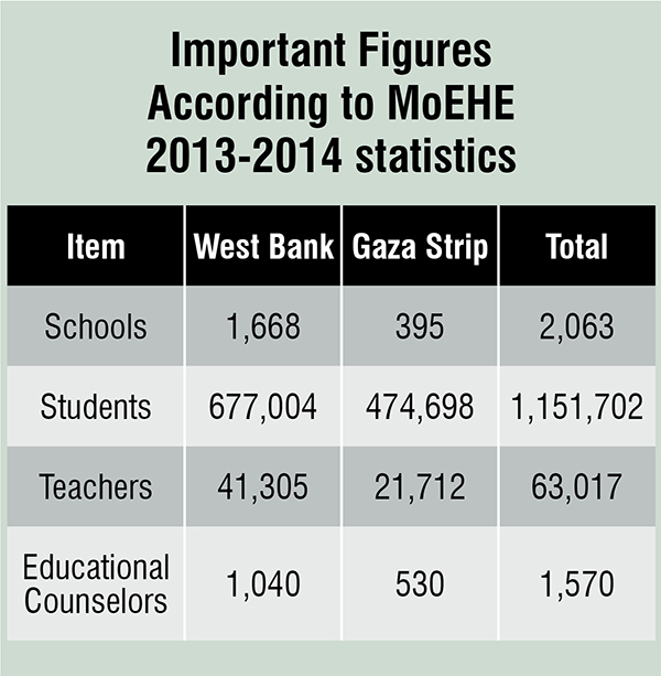 According to the Ministry of Education and Higher Education (MoEHE), there are 1,151,702 students enrolled in public schools registered under the umbrella of the Ministry, which employs a total of 1,570 educational counselors for the West Bank and the Gaza Strip.i Educational, not career counselors! Pay attention.