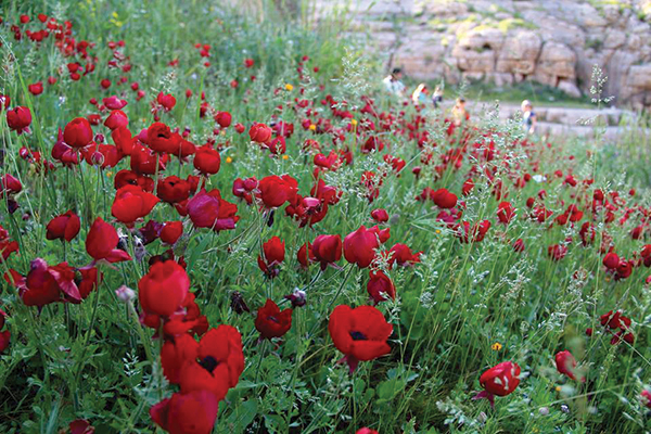 Arriving at Al-Fawwar Spring in the great Qelt Valley (Jericho) and going down the road after the bus departed, we were received by an enormous bed of violets and yellow and red local wild flowers. We entered the neatly groomed premises of the spring and noticed that “up there,” fluttering in the wind, were three Israeli flags.