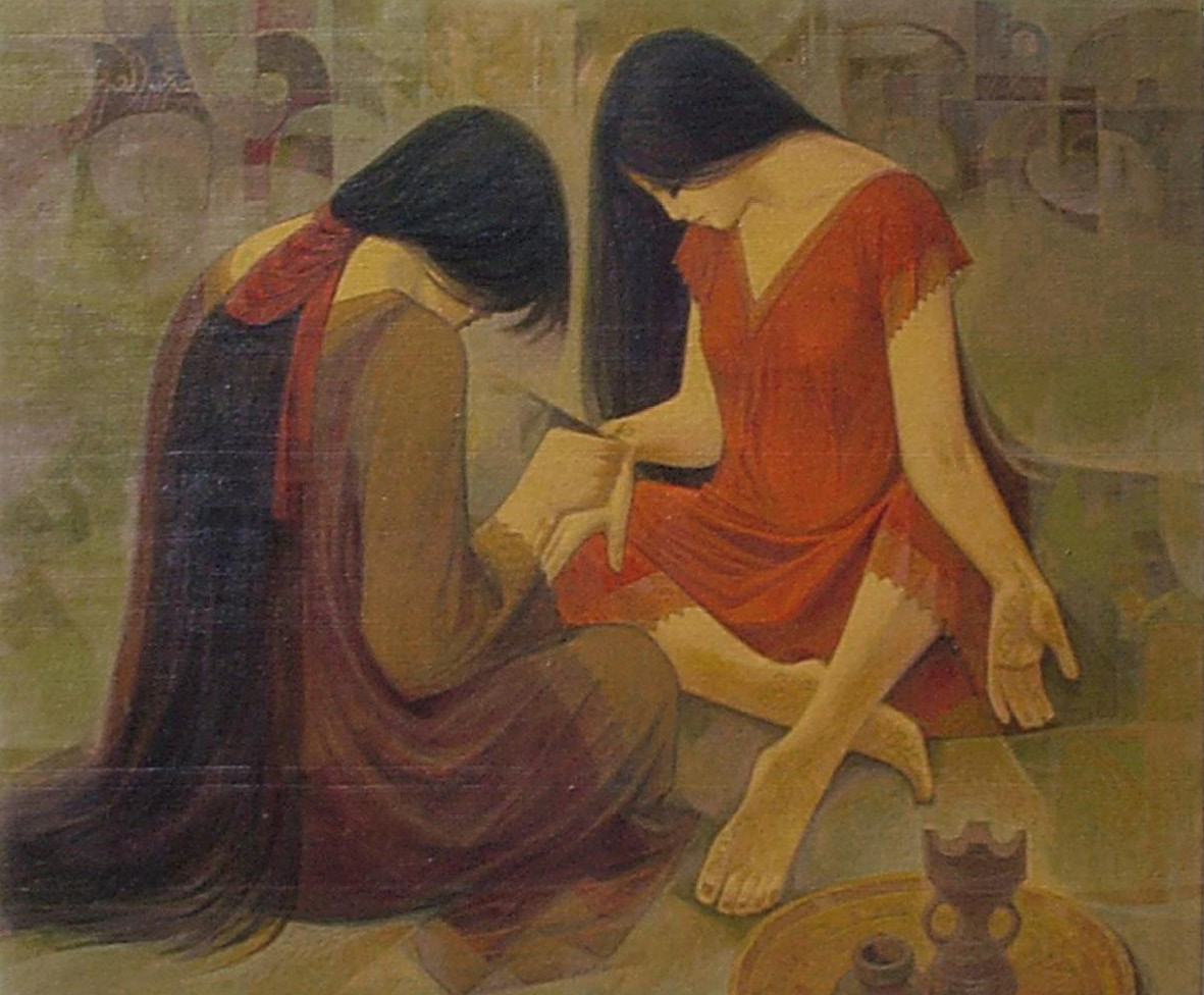 Born in 1941 in the village of Zakariya near Hebron, Nasr Eleyan’s earliest childhood memory is of pencil drawing. He drew the many animals that he saw in the village – birds, cats, sheep, chicken, etc. His family was forced to flee the village after it was occupied by Israeli militias in 1948, and they ended up in Ain al-Sultan Refugee Camp in the Jordan Valley. Nasr, however, continued to draw and experimented with different mediums. Later, he abandoned animals and focused more on women in their daily lives and local dresses – the central theme of most of his paintings. In the late 1950s, he participated in his first exhibit as a teenager where he presented three watercolor paintings that were praised by critics and journalists. Shortly after the exhibit, he discovered oil paint, a medium that he would love and use for the rest of his life.