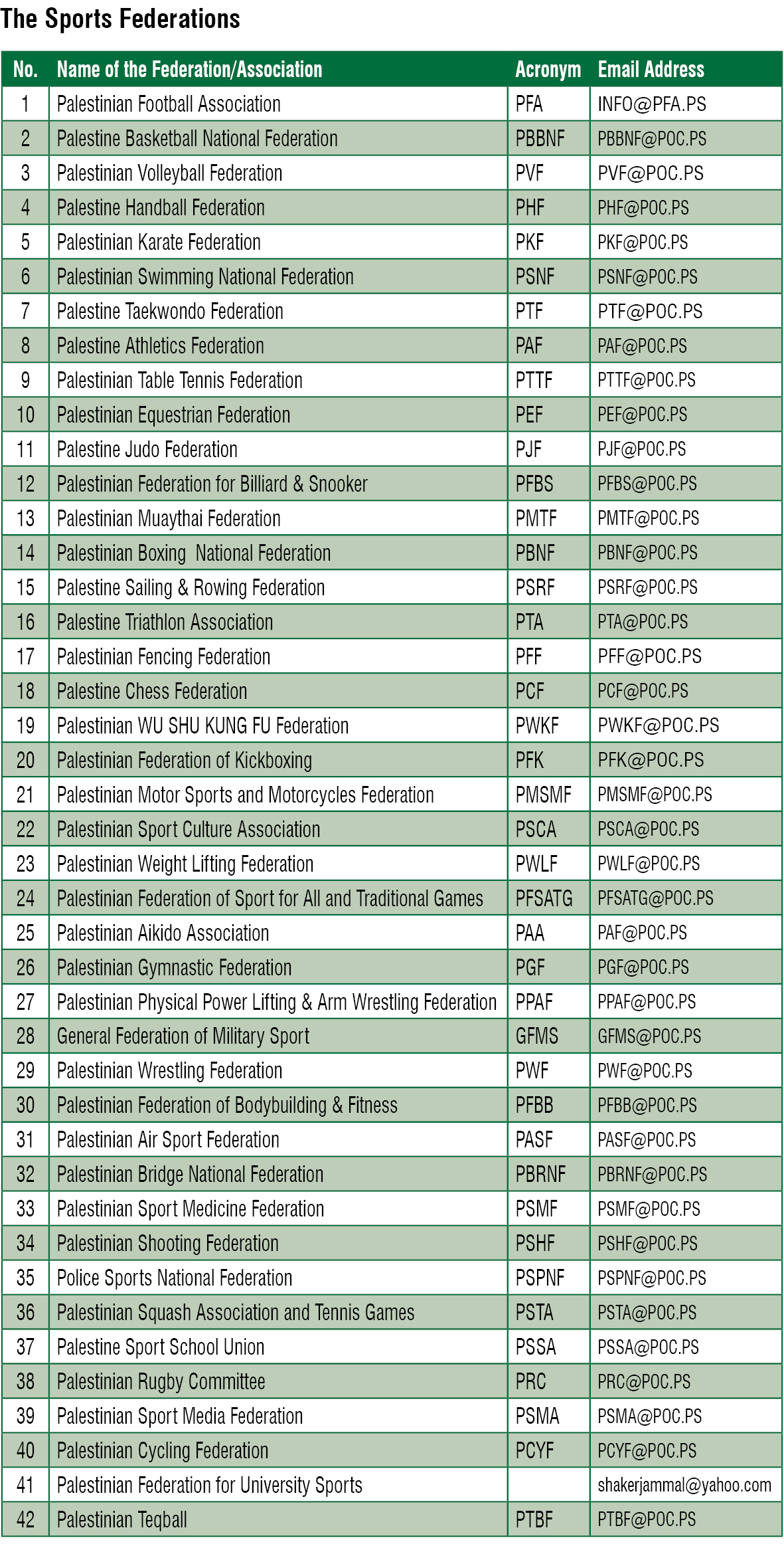 About 42 sports unions (groups, individuals, and specialized sports) fall under the umbrella of the Palestinian Olympic Committee nationally, including Olympic, global, and international sports.
