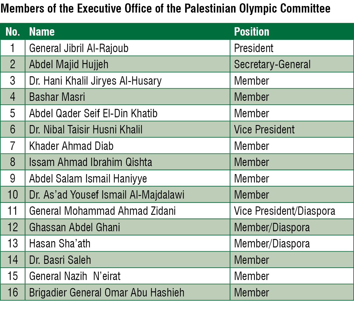 The PNOC Executive Bureau consists of 15 members and is chaired by General Jibril Al-Rajoub, whereas the PNOC Secretary General is General Abed Al-Majeed Hijjeh. The Executive Bureau is inclusive of the homeland and the diaspora. The most recent elections took place in 2017, and its term ends in 2020, following the prospective Tokyo Olympics.