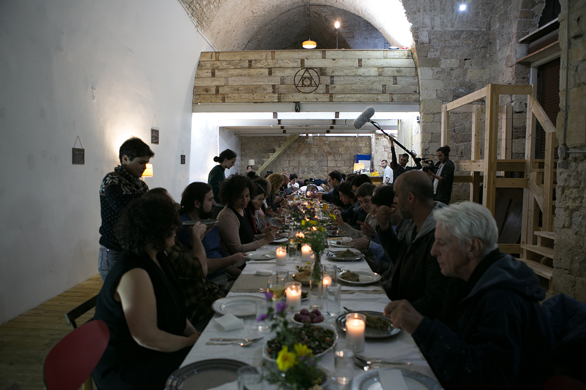 The dinner was held at Al-Manjam Gallery in Haifa, and the invitation was an open event for 40 people. The menu relied on the family’s pantry, the produce grown on their private land, and some products that women in the family make and share with their relatives (such as maftool).